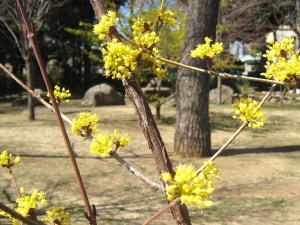 少し春の訪れが少し園内はコブシ、サンシュユ、ヒョウガミズキ、ユキヤナギなどの花木が見頃となり、