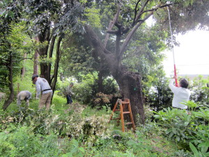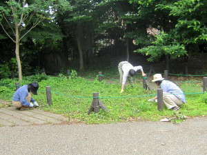 草のビオトープの草引き、菊花壇の支柱立てや苗の植え込み、保全区域の枝打ちなど、