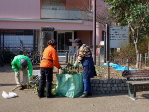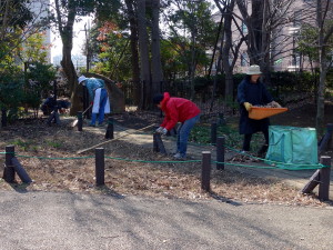 草のビオトープや保全区の落葉掃き、菊花壇の上に影をおとしているネズミモチの剪定、