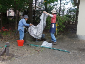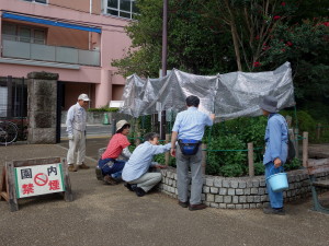季節に合わせてつぼみが見え始めた菊花壇の遮光ネット外しから作業を始めました。