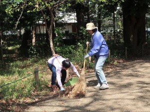 落ち葉がほぼ掃き尽くされた園路では、イヌシデの大量の雄花を集める様子が見られました。 |