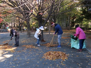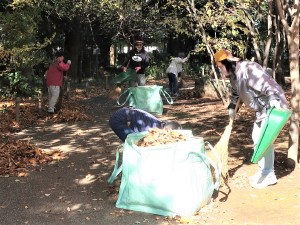 イベント参加の方々の協力も得て、園路から始めた落ち葉掃きが見事な早さで終了、
