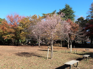 十月桜と紅葉のコンビネーションが美しい園内では、サクラが葉っぱをほとんど落とし、