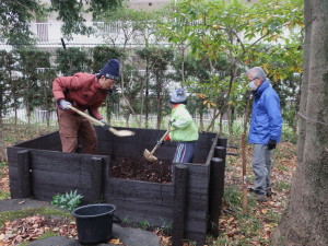 イベントは中止でしたが、緑グループメンバーは集合、10月にやり残した落ち葉溜めの切り返しを行い、